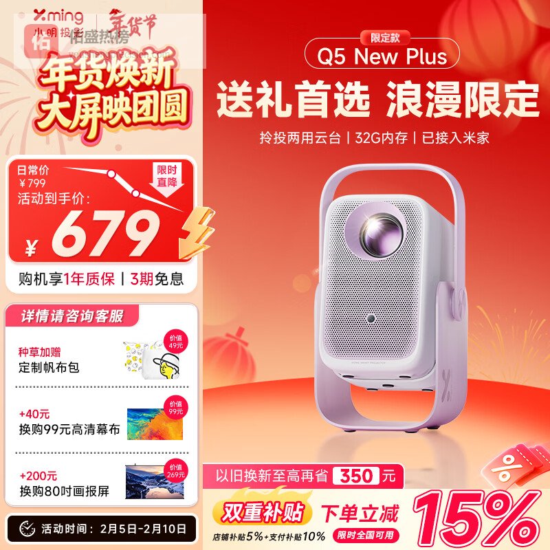 【京东自营】小明Q5NeoPlus限定款【梦幻粉紫】投影仪家用超清便携卧室家用便携1080P高清家庭¥