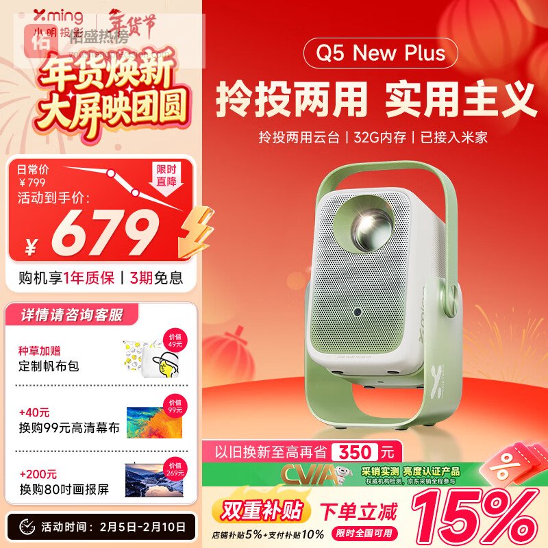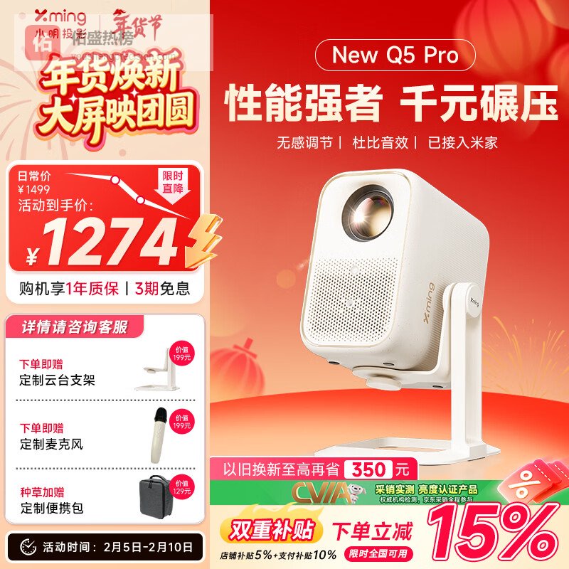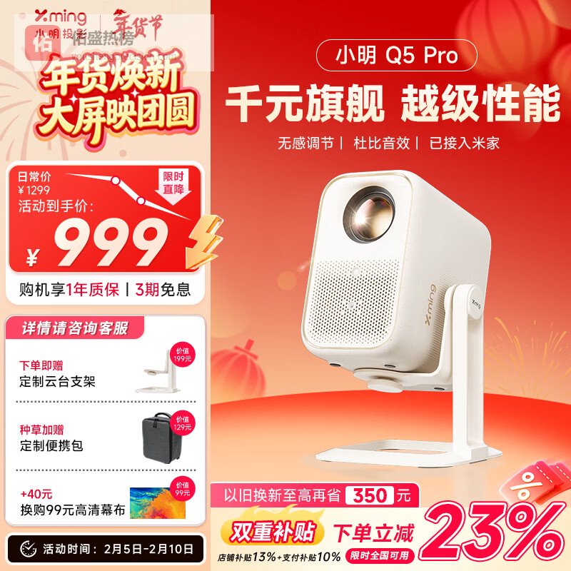 【京东自营】小明NewQ5Pro投影仪家用一体化云台真1080P便携高清家庭影院卧室投影机¥
