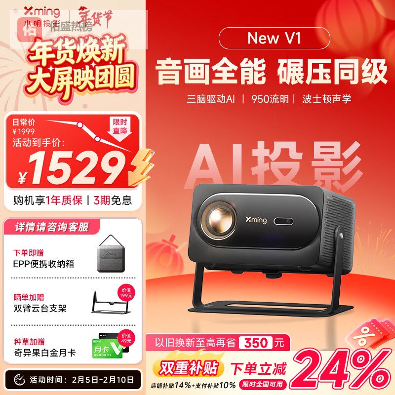 【京东自营】小明NewV1高亮版投影仪家用1080P客厅卧室家庭影院游戏投影机AI智能语音¥