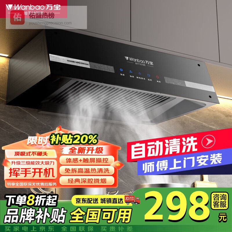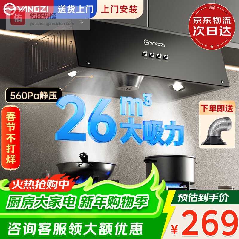 2026年中式油烟机哪个牌子好,销量榜品牌值得选购一、扬子参数:26m³/min吸力、680PA高风压、自动热清洗、一键操作、拆卸滤网