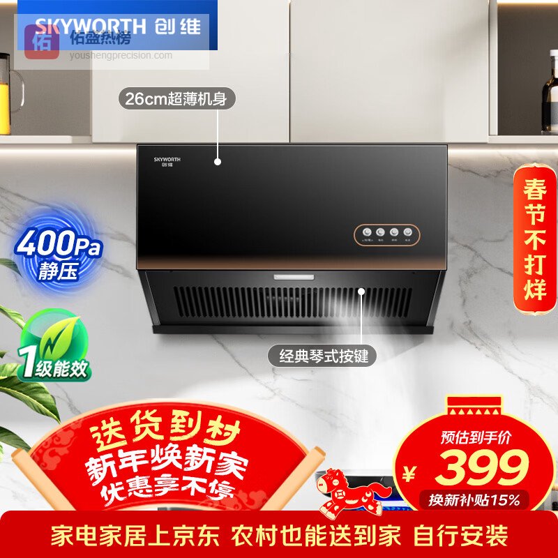 九、创维参数:侧吸式、超薄26cm、风量17m³/min、一级能效、静压400Pa
