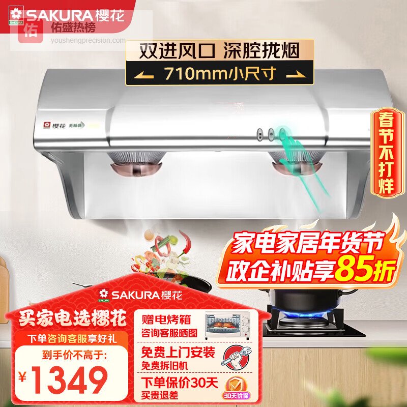 二、樱花参数:一体成型集烟腔、双马达、冷光照明、双层油网、斜背式设计