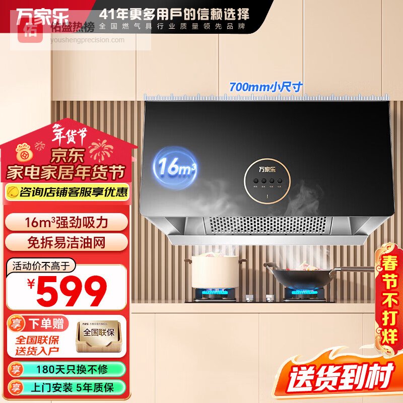 三、万家乐参数:700mm尺寸、16m³/min吸力、420Pa防倒灌、一级能效、易拆油网