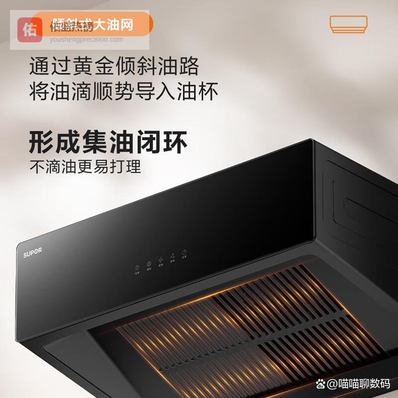 十、苏泊尔参数:18立方米/分钟大吸力、深腔拢烟设计、450Pa强劲风压、倾斜式大油网、触控操作面板