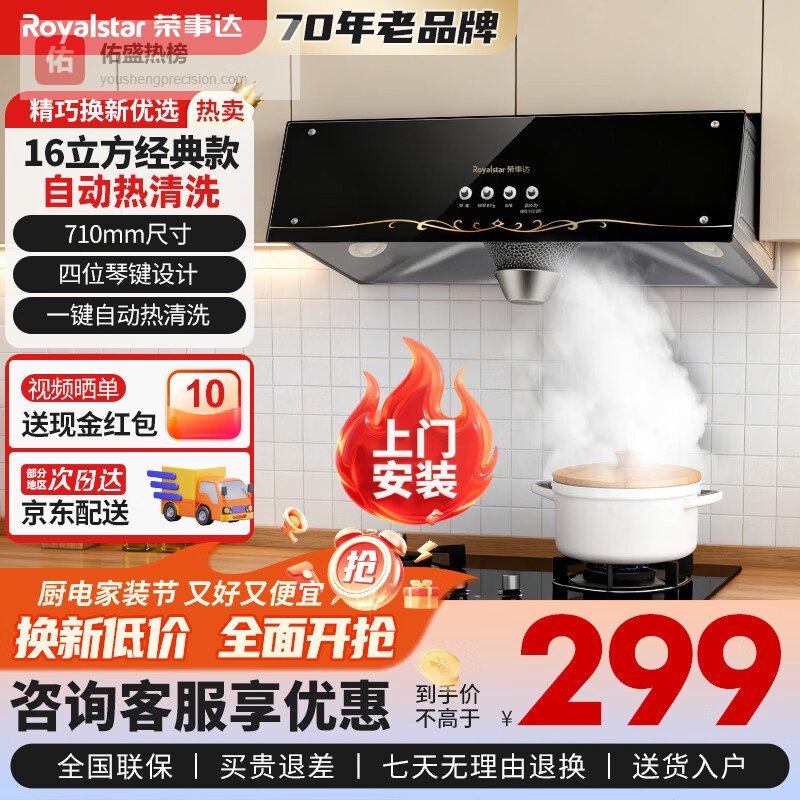 荣事达(Royalstar)油烟机中式抽油烟机家用大吸力老式小尺寸公寓小户型出租房厨房顶吸式老款吸油烟机 【上门安装】全封闭电机+按键款(16立方经典款)¥