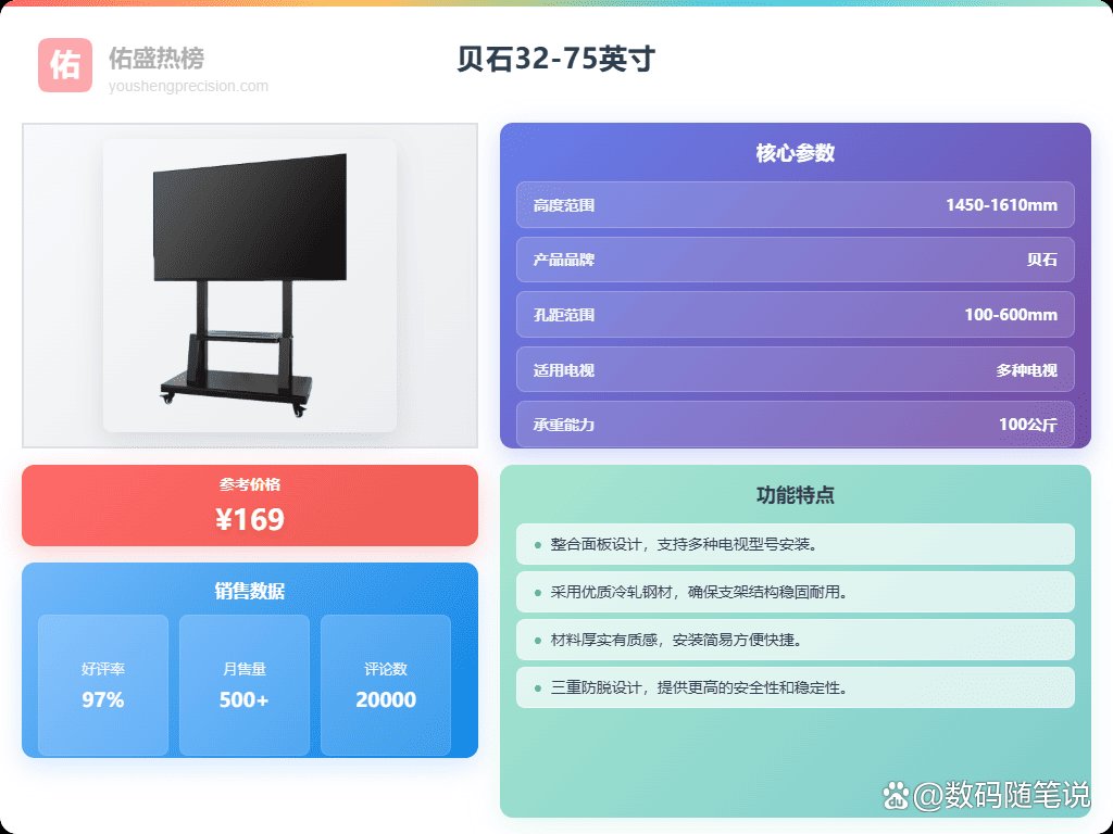 四、贝石贝石品牌专注于为现代家庭提供耐用且实用的电视支架及配件,产品设计结合功能性与安全性,旨在提升家庭娱乐体验。其产品广泛应用于各类智能电视、平板电视以及曲面屏幕,强调兼容性和稳固性,深得用户信赖。贝石一直坚持用优质材质,结合先进制造工艺,确保每个产品都能经得起时间考验,既安全又实用。