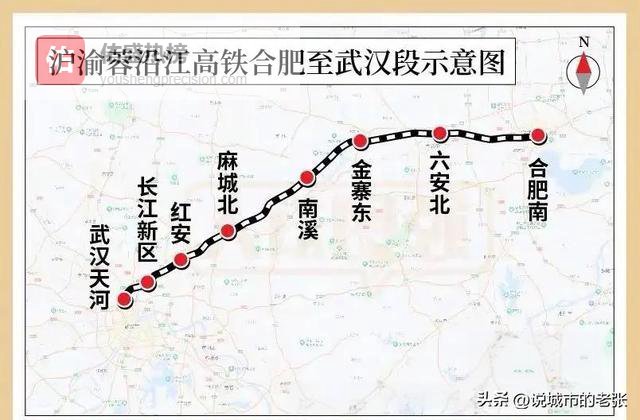 合肥至武汉段安徽境内新建正线约166公里,设有合肥南、长安集、六安北、金寨东等车站,它标志着沿江高铁全线进入建设阶段,未来将使合肥与武汉形成“1小时生活圈”,并对大别山革命老区发展起到重要推动作用。该段已于2024年1月正式开工建设,建设工期为4.5年。