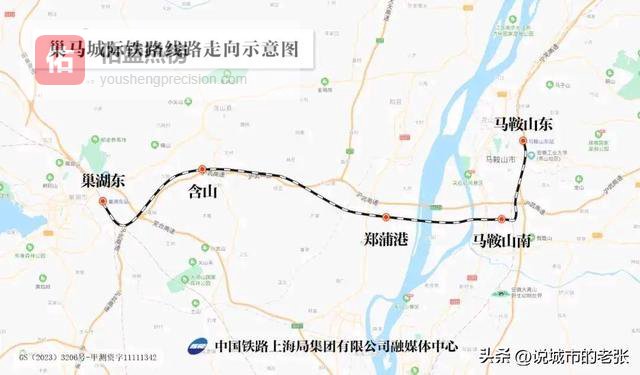 巢马城际铁路,正线全长约61.4公里,设计时速为350公里,巢湖东站、含山站、郑蒲港站、马鞍山南站、马鞍山东站,是安徽省首条省市共建的城际铁路。