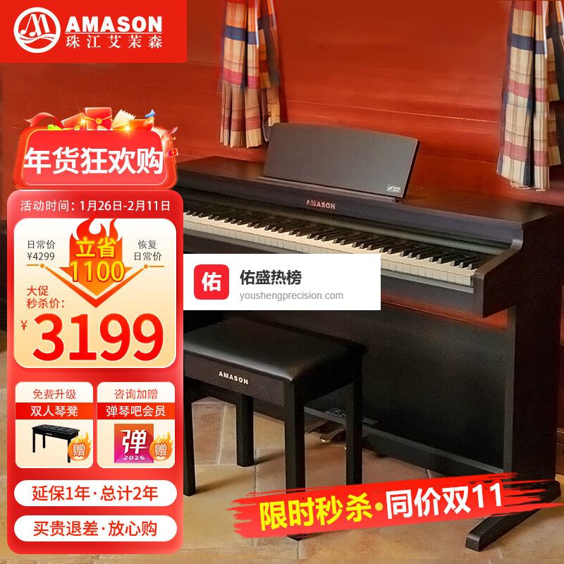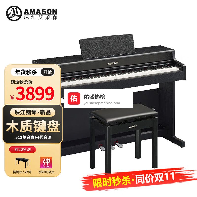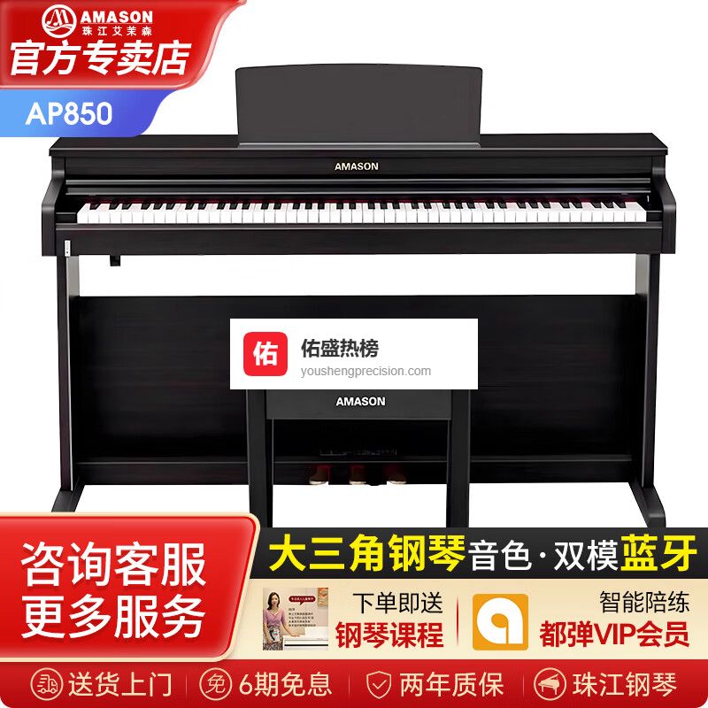 艾茉森(Amason)珠江电钢琴88键重锤立式儿童成人初学专业考级家用智能数码电钢琴 AP850¥