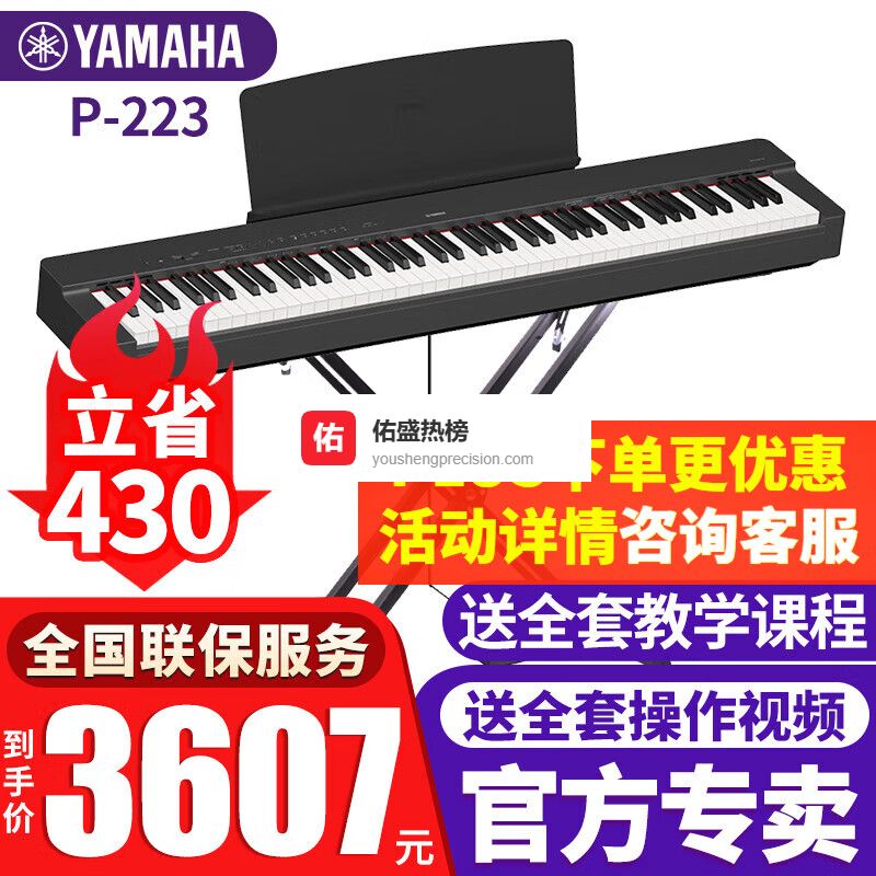 雅马哈电钢琴P223初学入门88键重锤成人儿童考级便携智能数码电子钢琴 P223B黑色+X架+单踏板+官方标配¥