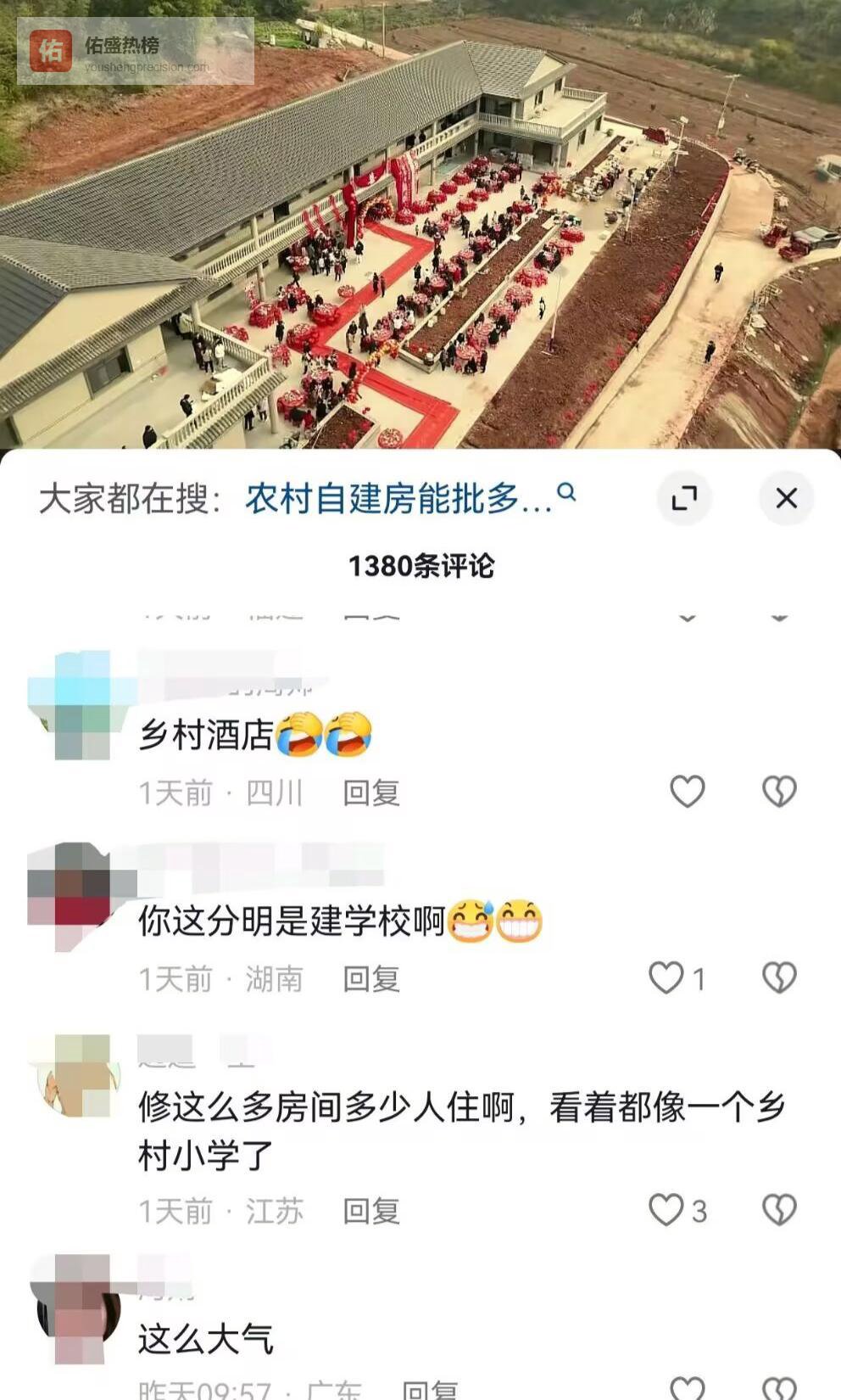 这段视频一经发布,评论区瞬间炸开了锅。有网友直言“第一眼看成村小翻新了,没想到说是村民住宅”,也有网友满脸疑惑“农村能建这么大的房子?是不是违规占用土地,把学校改成自家房子了”,更有网友直接质疑“这么大体量的联排房,大概率是违建,没经过审批吧”。