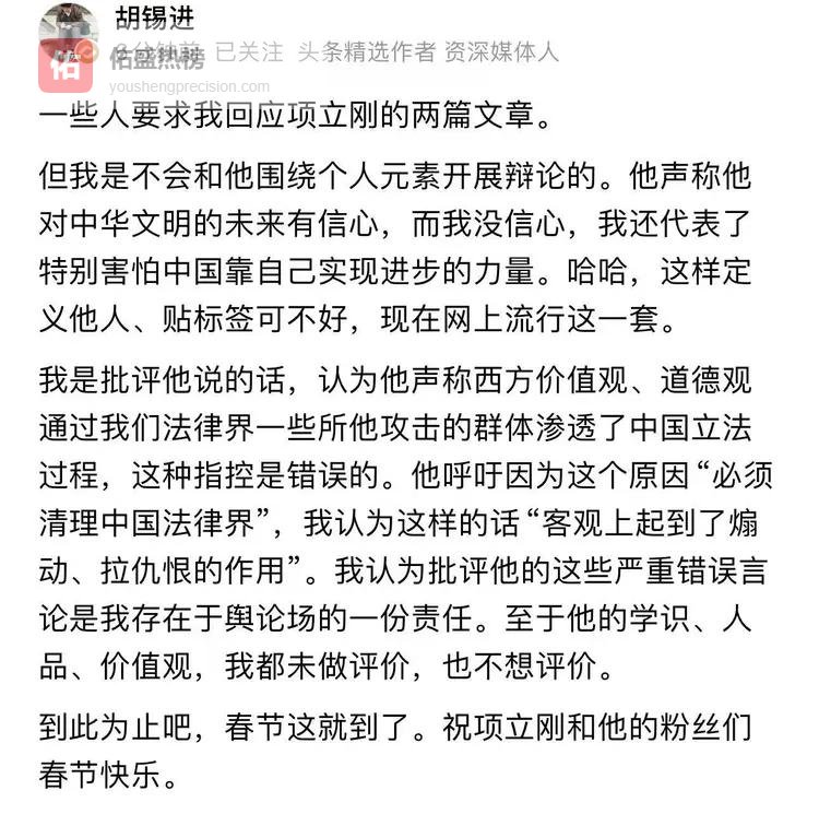 胡锡进春节前回应项立刚争端:别让扣帽子毁了我们的理性讨论底线