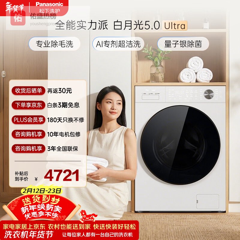 松下(Panasonic)白月光5.0Ultra 滚筒洗衣机 10KG大容量 全自动家用 深净级除毛 水氧防过敏 XQG100-82M1¥
