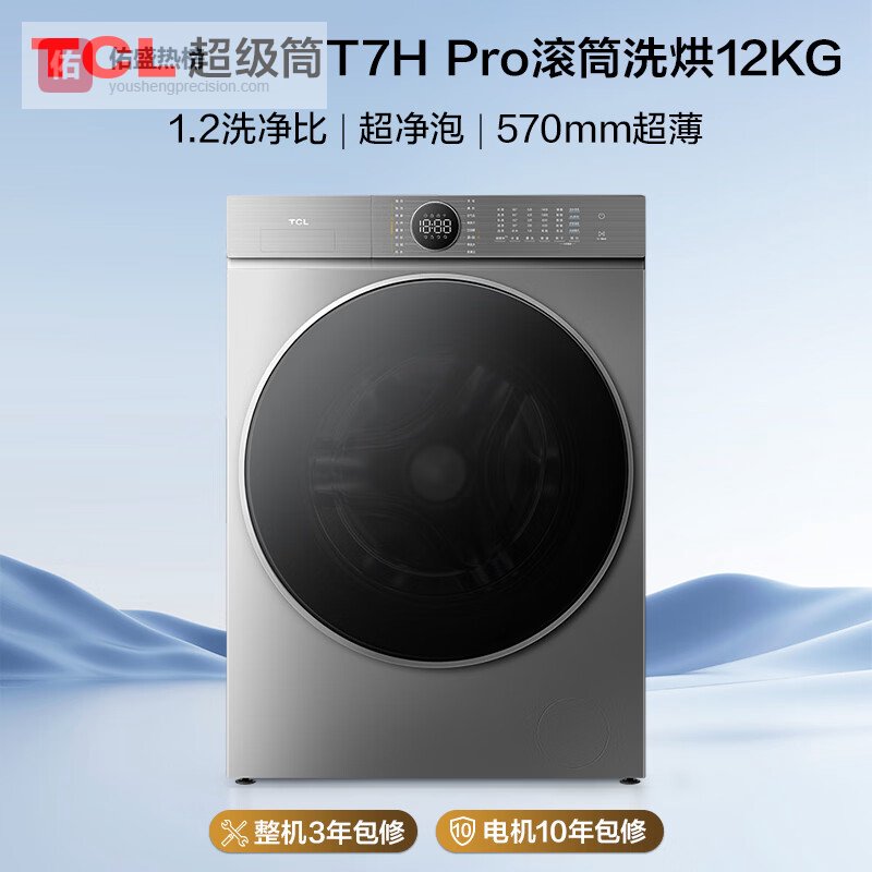 4、TCL T7H Pro这款TCL G120T7H-HDIS洗衣机配备了大容量的滚筒设计,最大洗涤容量达12公斤,烘干也能达到9公斤,特别适合家庭使用。它采用超薄机身设计,宽度仅570mm,方便嵌入各种空间,既节省空间,又不影响整体美观。用户评价中提到,机器的外观简约大方,黑色机身耐看,与洗衣台搭配很协调。