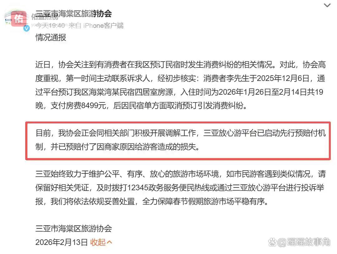 随着事件的持续升温,三亚市海棠区旅游协会于2月13日夜间迅速发布了一则通报,声明已主动介入调解工作,并已启动了先行预赔付机制。