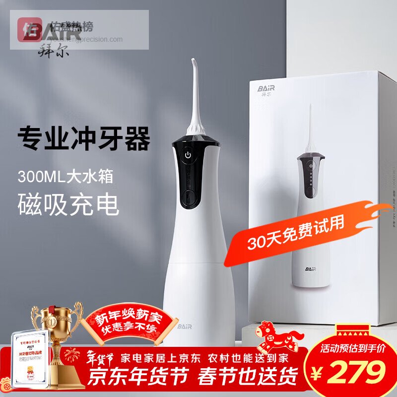 推荐理由:这款拜尔M4冲牙器,无级调压设计挺贴心的,可以根据自己的牙龈敏感程度调节水压,用起来不会觉得刺激难受。而且它还配了好几个不同功能的喷头,像标准喷头、正畸喷头都有,照顾到不同人群的需求。