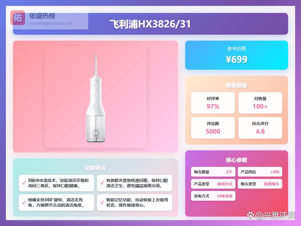 那么,到底选哪款呢?别着急,我再给点更具体的建议。如果牙齿比较敏感,想要温和清洁:拜尔M4的无级调压会比较适合你,可以慢慢找到最舒适的水压。如果追求更深层的清洁,并且不介意价格稍高:飞利浦HX3826/31的X脉冲水流技术或许能给你带来惊喜。如果预算有限,但又想体验丰富的功能:月儿弯弯900W紫光高频版绝对是你的不二之选,性价比真的很高。
