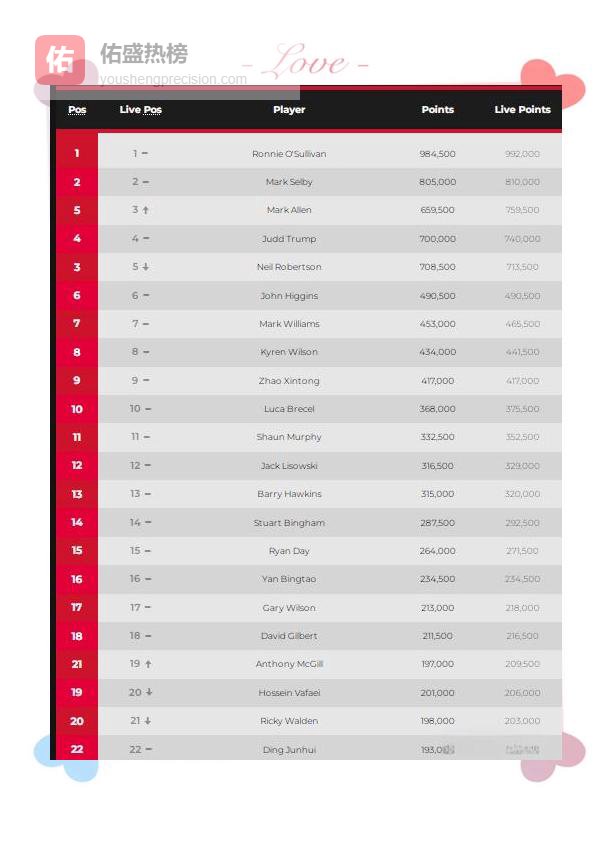 根据奖金换算,艾伦单赛季夺冠奖金约合人民币349万元, 赵心童以41.7万英镑(约3491万元)高居中国球员第一;颜丙涛收获23.45万英镑(约1963万元)紧随其后;丁俊晖也以20.05万英镑(约1679万元)守住第22位。此外,周跃龙、肖国栋、吕昊天分别位列第26、33、36位,范争一、鲁宁也稳居前50,为中国军团提供持续火力。