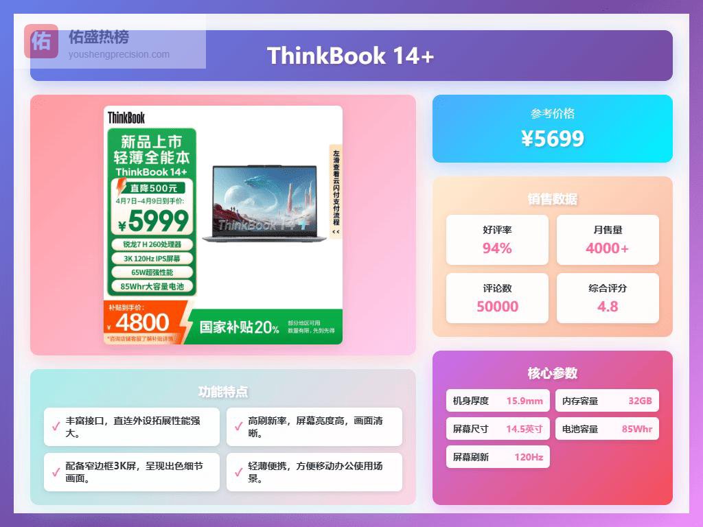 这款笔记本还支持多场景使用的扩展接口,如USB4、HDMI、RJ45等,连接外设方便不少。轻薄的机身设计,厚度在14-18mm之间,重量约在1-1.5kg,携带在外也挺便利。内置85Wh大容量电池,续航表现还行,快速充电也不错,30分钟能充到50%左右,让你出差不用太担心电量问题。整体来看,这款ThinkBook 14+在性能、便携和显示方面倒是挺全面的,适合想要一款功能均衡的办公本用户。