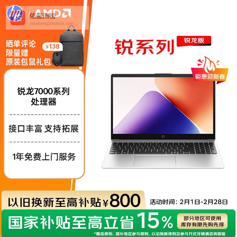 惠普(HP)锐15 AMD锐龙 15.6英寸轻薄笔记本电脑(六核R5-7535U 16G 512G 指纹 一年上门)¥