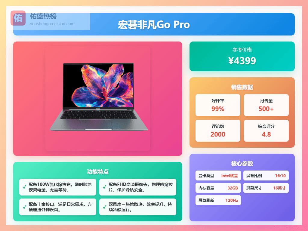 五、宏碁这款宏碁非凡Go Pro配备了强大的第十三代英特尔酷睿i5-13500H处理器,拥有12核16线程,最高睿频达4.7GHz,性能表现确实不错。多任务处理时还能保持流畅,不会卡顿,基本可以应付日常办公、创意设计等多种需求。搭载高速的16英寸IPS屏幕,分辨率达2.5K,屏占比超过90%,视觉体验相当舒服,色彩表现也很真实,支持高达120Hz的刷新率,减少拖影,让浏览和编辑视频时更加顺畅。