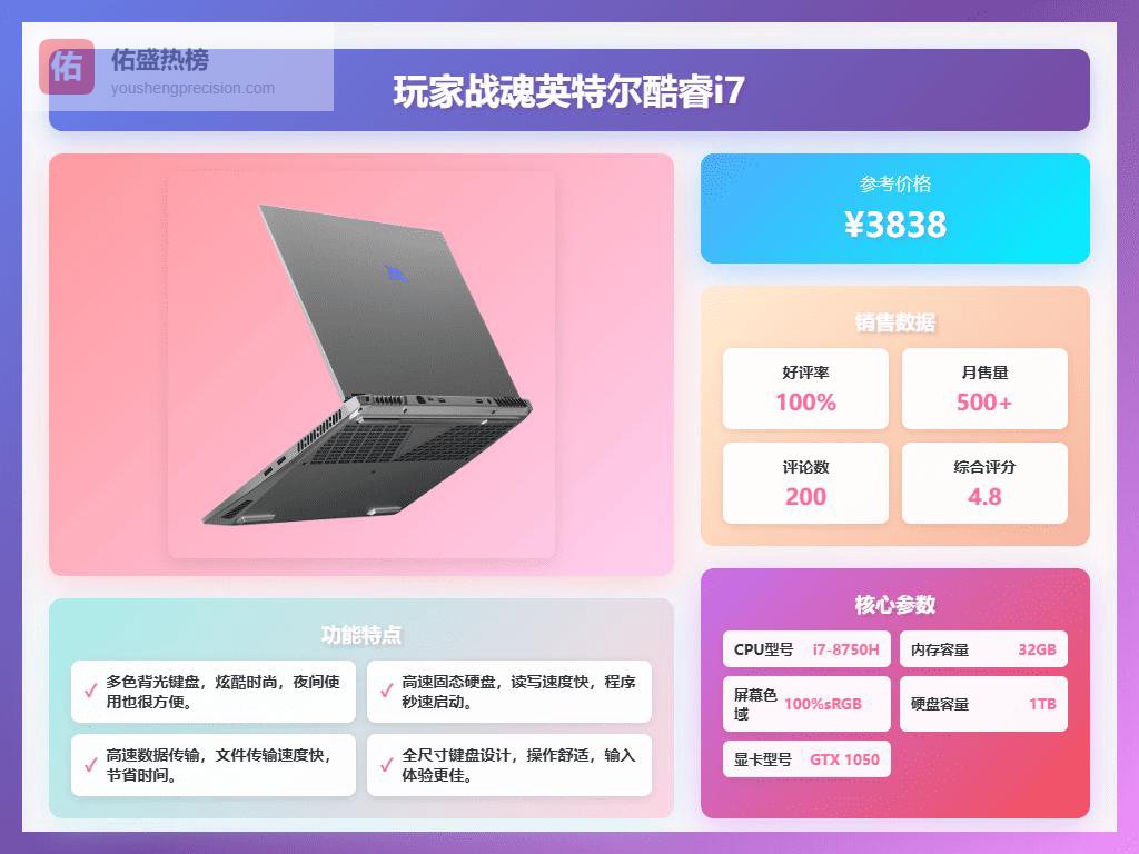 九、玩家战魂这款玩家战魂英特尔酷睿i7笔记本配备了第十代酷睿处理器,拥有6核心12线程,最高频率可以达到4.1GHz,性能确实挺不错,基本满足多任务和日常办公需求。配备的NVIDIA GTX 1050独立显卡,带有4GB显存,能够应付许多主流游戏和图形处理工作,也适合进行一些平面设计或轻量级剪辑。这样的硬件组合在性能和能耗之间保持了不错的平衡,倒是挺适合需要一台高性能便携机的用户。