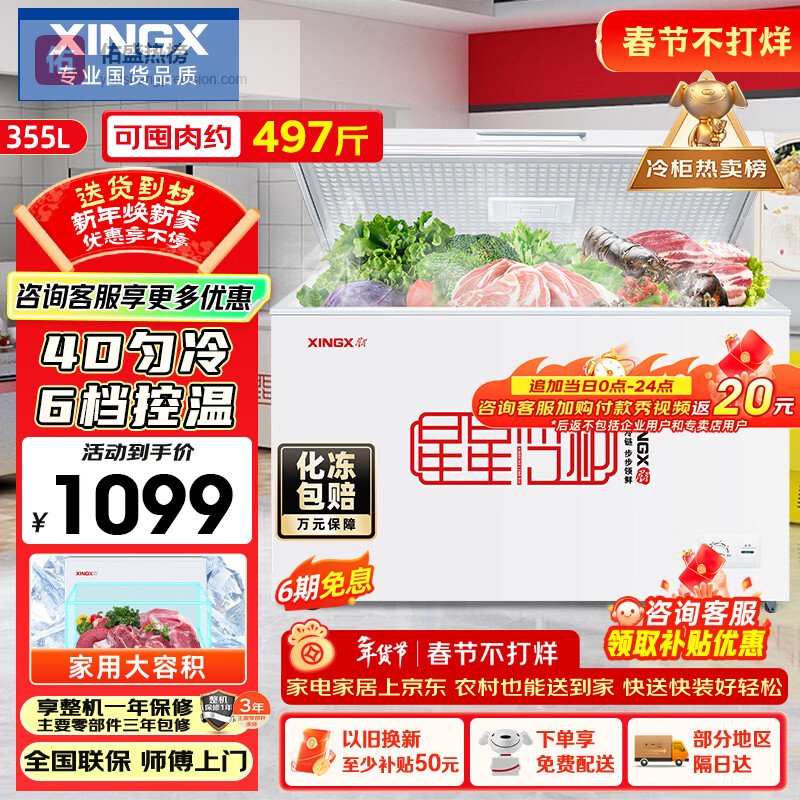 第3款:星星BD/BC-355E这款星星冷柜容量确实挺大的,355升,能放不少东西。顶开门设计我觉得还行,拿取东西挺方便,而且也能减少冷气跑出去。16kg/12h的冷冻能力也还不错,冻东西速度挺快,不管是家用还是商用,基本都够用了。