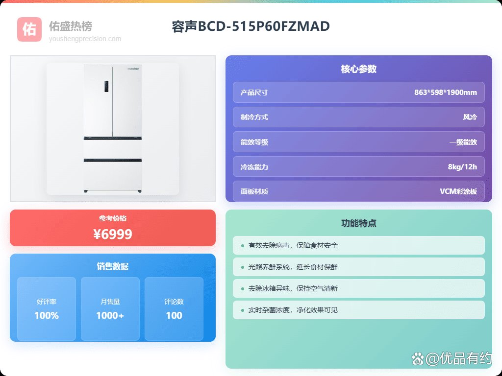 第1款:容声515升方糖这款容声冰箱主打健康保鲜,它自带IDP双净2.0技术,冷藏冷冻都能主动除菌,号称除菌率高达99.9999%,除病毒率也有99.9%。这还不够,它还能除异味、除乙烯,甚至能抑制霉菌生长,感觉放进去的食材能多保鲜几天。另外是独立双系统,冷藏冷冻独立制冷,这样就不用担心串味了,这点还挺实在。