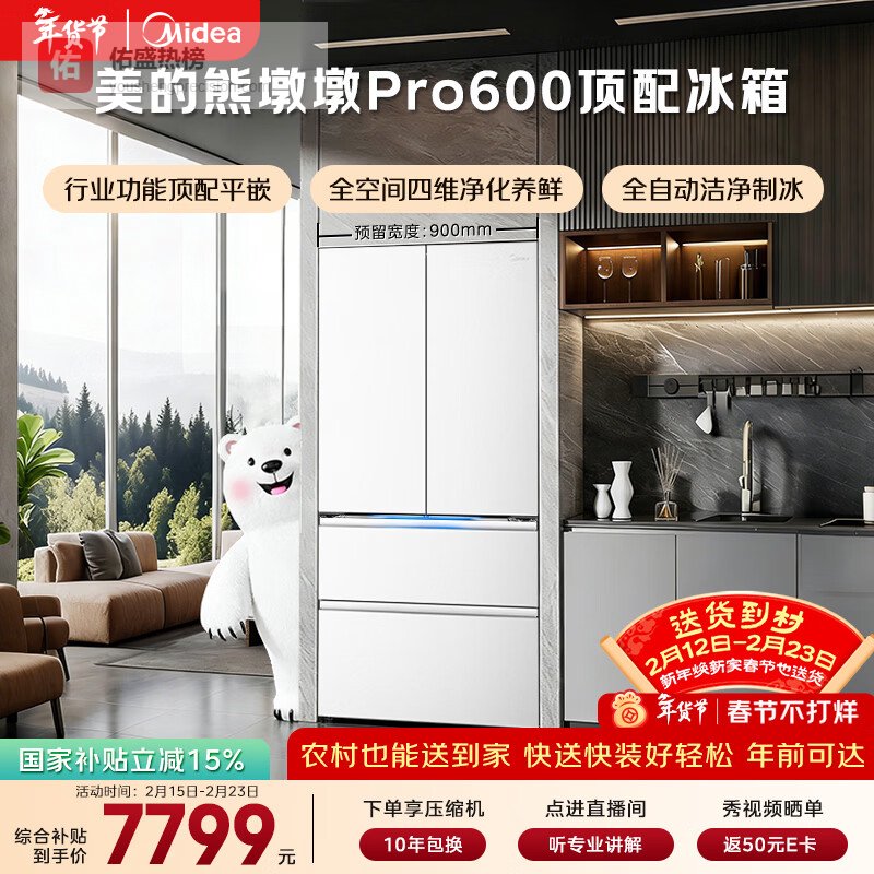 美的(Midea)熊墩墩Pro600L法式四开门冰箱超薄嵌入式双系统一级能效除菌制冰大容量BCD-600WUFIPZM(E)国家补贴¥