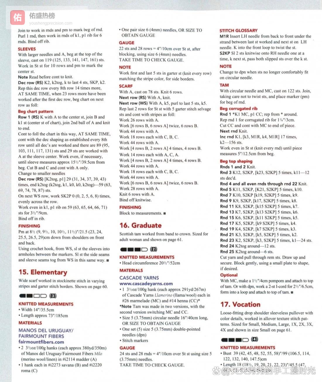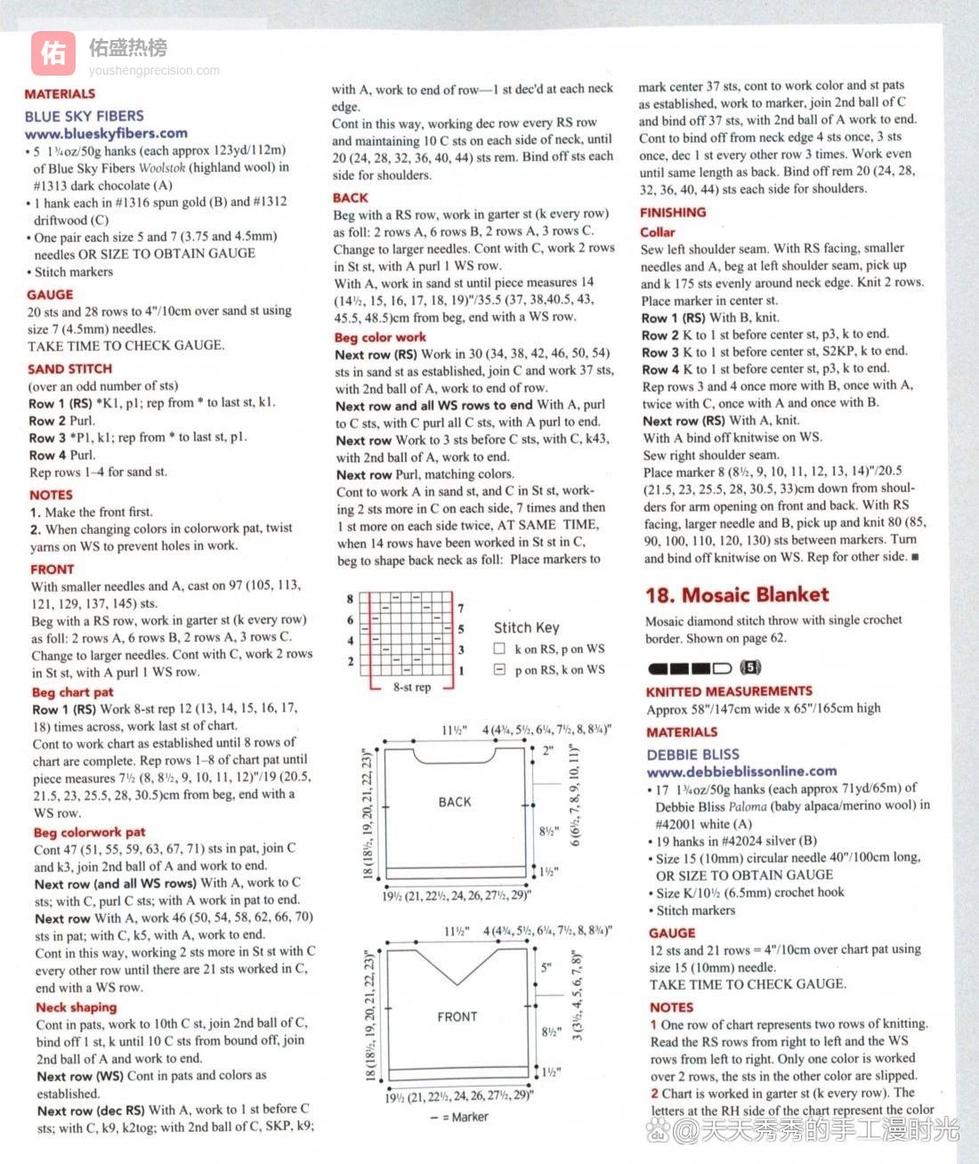 分享打动我的手工作品,希望能同样打动你,并给你带去手工的无限乐趣和无穷魅力。作品点评:本款作品由设计师Lori Steinberg设计,是一款宽松版型的落肩无袖套头衫,也可称为针织马甲,采用全件纹理编织,搭配撞色细节设计,简约又不失设计感,短款的版型适配高腰下装,可优化身材比例,是春秋季节极具实穿性的叠穿单品。本款尺寸覆盖从小码到4X共7个尺码,可适配不同身形的穿着需求,成品胸围范围为99厘米至147.5厘米,衣长范围为45.5厘米至58.5厘米,宽松的落肩设计不挑肩型,包容性强,无论是单穿还是叠穿都非常合适。线材方面,采用Blue Sky Fibers品牌的Woolstok线,成分为高地羊毛,绒感丰富,保暖性佳,手感柔软,适配春秋冬三季穿着;配色分为深巧克力色主色、纺金色、浮木色共3个颜色,通过正面的菱形提花与背面的沙砾纹编织,搭配领口、袖窿的撞色装饰,打造出丰富的纹理与色彩层次,简约又不单调。工艺设计上,本款采用两种不同针号编织,3.75毫米小针号用于起底袜带针、领口与袖窿边缘,4.5毫米大针号用于主体纹理编织,标准密度为沙砾纹纹样10厘米见方20针28行;核心纹样分为两种,前片为菱形提花图案,后片为沙砾纹,即4行一组的上下针交替纹理,打造出正反两面不同的质感;结构上,前后片分别片织,完成起底袜带针后换大针号,前片先编织平针过渡段,再按图解编织菱形提花图案,之后进行领口与肩部塑形;后片全程用沙砾纹编织,同步完成后领与肩部塑形;前后片肩部缝合后,领口挑针编织撞色翻领,袖窿边缘挑针后直接收针,打造出简洁的包边效果;整体采用往返片织,工艺简洁,无需复杂的袖山编织,新手也可轻松上手。成品风格简约大气,可搭配衬衫打造通勤学院风,也可搭配T恤打造休闲日常风格,还可搭配连衣裙打造叠穿效果,适配日常出行、通勤、校园、休闲聚会等多种场景,是一款兼具设计感与实穿性的手工针织单品。难度级别:三星方法说明:棒针往返片织,包含袜带针编织、沙砾纹编织、菱形提花编织、加针减针塑形、领口挑针编织、3针收针法、缝合定型技法图解来源网络,整理存解自用。材料准备、图解及方法说明:1. 成品尺寸(1)胸围:39(42,45,48,52,55,58)英寸,即99(106.5,114,122,132,140,147.5)厘米(2)衣长:18(18.5,19,20,21,22,23)英寸,即45.5(47,48.5,51,53.5,56,58.5)厘米2. 材料与工具准备(1)线材:Blue Sky Fibers品牌Woolstok高地羊毛线,每团50克约112米,主色(A)深巧克力色,用量5团;撞色(B)纺金色、撞色(C)浮木色各1团(2)工具:5号(3.75毫米)与7号(4.5毫米)棒针各一副,或能达到对应编织密度的针号;记号扣若干3. 编织密度(1)使用4.5毫米棒针,编织沙砾纹纹样,10厘米见方为20针28行(2)正式编织前请务必核对编织密度4. 循环纹样说明(1)沙砾纹(奇数针)① 第1行(正面):织1针下针,织1针上针 ,重复循环,最后织1针下针② 第2行(反面):全针织上针③ 第3行(正面):织1针上针,织1针下针 ,重复循环,最后织1针上针④ 第4行(反面):全针织上针⑤ 重复第1-4行完成沙砾纹循环5. 前片编织(1)起针:使用3.75毫米小针号与主色A,起97(105,113,121,129,137,145)针(2)起底袜带针:正面行全针织下针,重复2行;换撞色B全针织下针,重复6行;换主色A全针织下针,重复2行;换撞色C全针织下针,重复3行(3)换4.5毫米大针号,用撞色C织2行平针,用主色A织1行反面行上针(4)菱形提花编织:① 第1行(正面):8针的图解循环重复12(13,14,15,16,17,18)次,织图解的最后1针② 按图解规律持续编织,直至8行图解循环全部完成③ 按图解规律持续编织,直至织物从起针处量至7.5(8,8,9,10,11,12)英寸,即19(20.5,21.5,23,25.5,28,30.5)厘米,以反面行结束(5)撞色与领口塑形:① 持续按纹样编织,直至剩余47(51,55,59,63,67,71)针,接入撞色C织3针,接入第二团主色A织至行尾② 下一行及所有反面行:用主色A织至撞色C针目,撞色C针目全针织上针,用主色A按纹样织至行尾③ 下一行:用主色A织46(50,54,58,62,66,70)针,撞色C织5针,用主色A织至行尾④ 持续按此规律,每隔1行撞色C的针目增加2针,直至撞色C针目达到21针,以反面行结束(6)V领塑形:① 持续按纹样编织,直至第10个撞色C针目,接入第二团撞色C,收1针,织至距离收针位置10个撞色C针目,接入第二团主色A织至行尾② 下一行(反面):按既定颜色与纹样持续编织③ 减针行(正面):用主色A织至撞色C针目前1针,撞色C织9针,2针下针并1针;第二团撞色C织左上2针并1针,织9针,用主色A织至行尾,领口两侧各减少1针④ 减针行每行重复,同时保持领口两侧各有10针撞色C针目,直至两侧各剩余20(24,28,32,36,40,44)针⑤ 两侧肩部针目分别收针6. 后片编织(1)起针、起底袜带针、换针部分,均与前片完全一致(2)换4.5毫米大针号后,全程用主色A按沙砾纹循环编织,直至织物从起针处量至14(14.5,15,16,17,18,19)英寸,即35.5(37,38,40.5,43,45.5,48.5)厘米,以反面行结束(3)撞色与后领塑形:① 下一行(正面):按沙砾纹织30(34,38,42,46,50,54)针,接入撞色C织37针,接入第二团主色A织至行尾② 下一行及所有反面行:用主色A织至撞色C针目,撞色C针目全针织上针,用主色A织至行尾③ 持续按此规律,每隔1行撞色C的针目两侧各增加2针,重复7次,之后两侧各增加1针2次,同时放置记号扣标记中心37针④ 持续编织,直至后片长度与前片相同,同时按以下规律完成后领塑形:织至记号扣位置,接入第二团撞色C,收掉中心37针,用第二团主色A织至行尾;持续从领口边缘收针,4针1次,3针1次,每隔1行减1针重复3次⑤ 两侧肩部剩余20(24,28,32,36,40,44)针,分别收