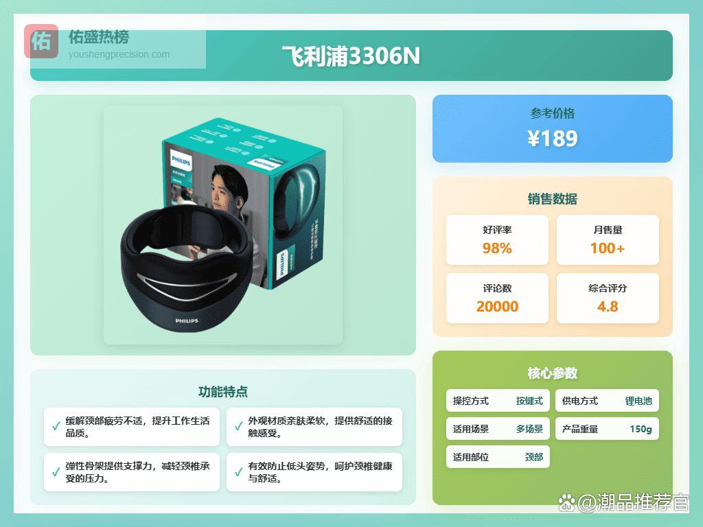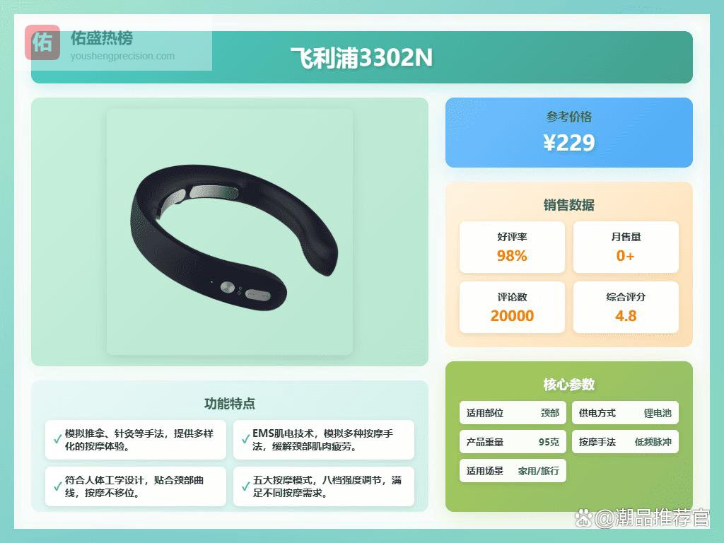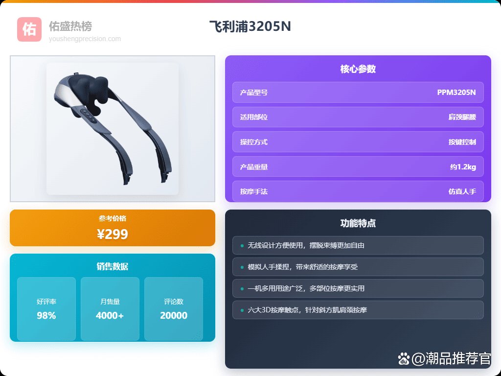 另外,如果你的颈椎问题比较严重,或者想按摩的部位更多,那可以考虑功能更全面的款式,像小金鱼Pro这种,按摩面积更大,还能覆盖腰背,钛金属按摩头也更耐用。当然,价格也会稍微贵一些。如果你预算有限,其实像3205N或者颈部按摩器PPM3306N这种性价比也挺高的,而且飞利浦的质量还是有保障的。总的来说,选购的时候要根据自己的实际情况和需求来选择,不要盲目追求高端,适合自己的才是最好的!