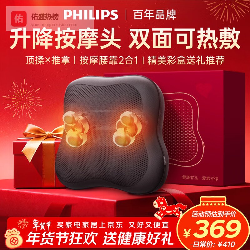 飞利浦(PHILIPS)珍可靠腰部按摩器 按摩靠垫肩腿背部颈椎按摩仪双面热敷顶揉腰靠3115B 生日礼物送男女朋友礼物¥
