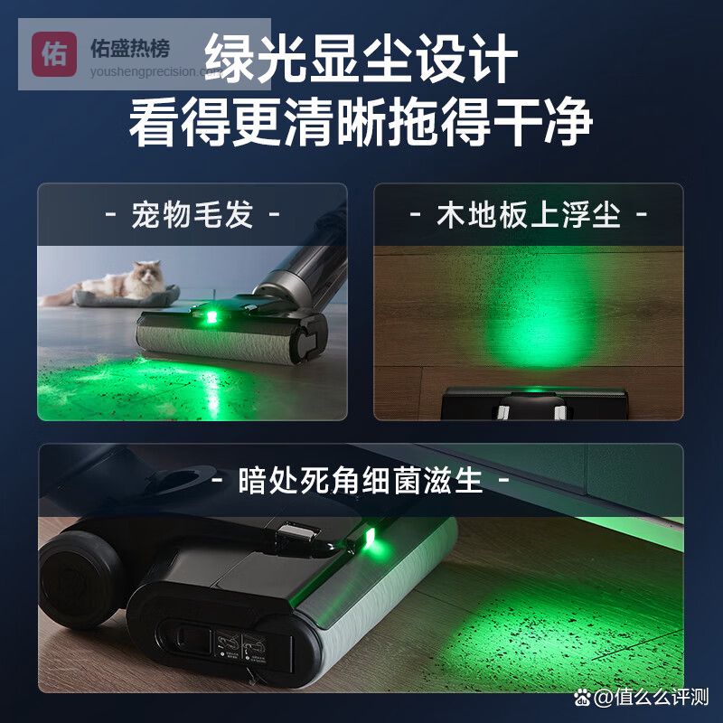 其次,这个绿光显尘功能真的太实用了!我之前拖地总感觉拖不干净,用了这个绿光一照,脏东西全暴露出来,一拖就干净,再也不用担心拖地越拖越脏了。