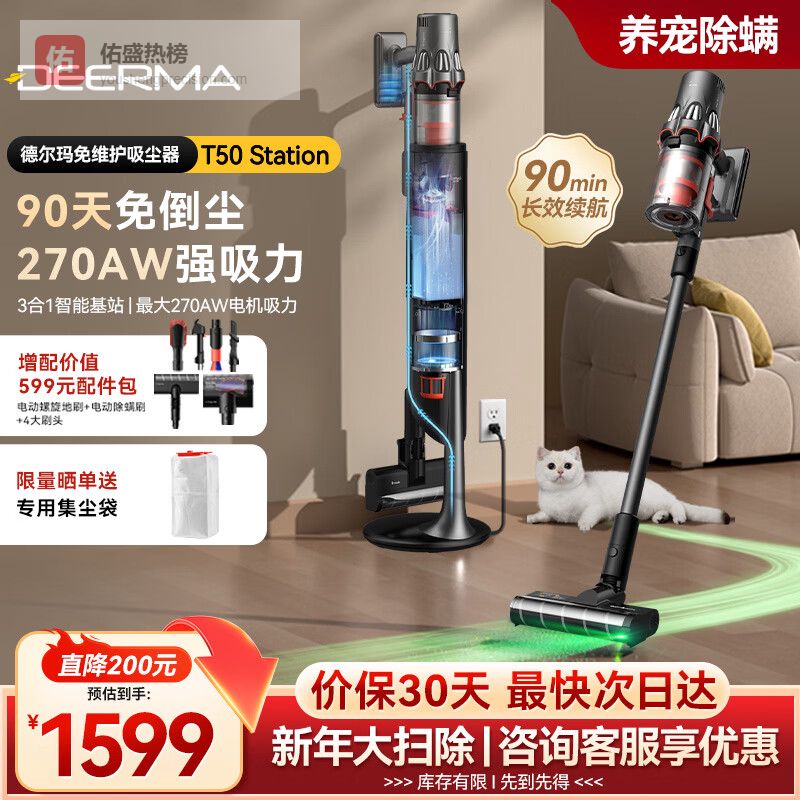 德尔玛(Deerma)【行业领先】自集尘吸尘器T50station 家用无线手持270AW大吸力 90分钟续航 毛发防缠绕90天免打理