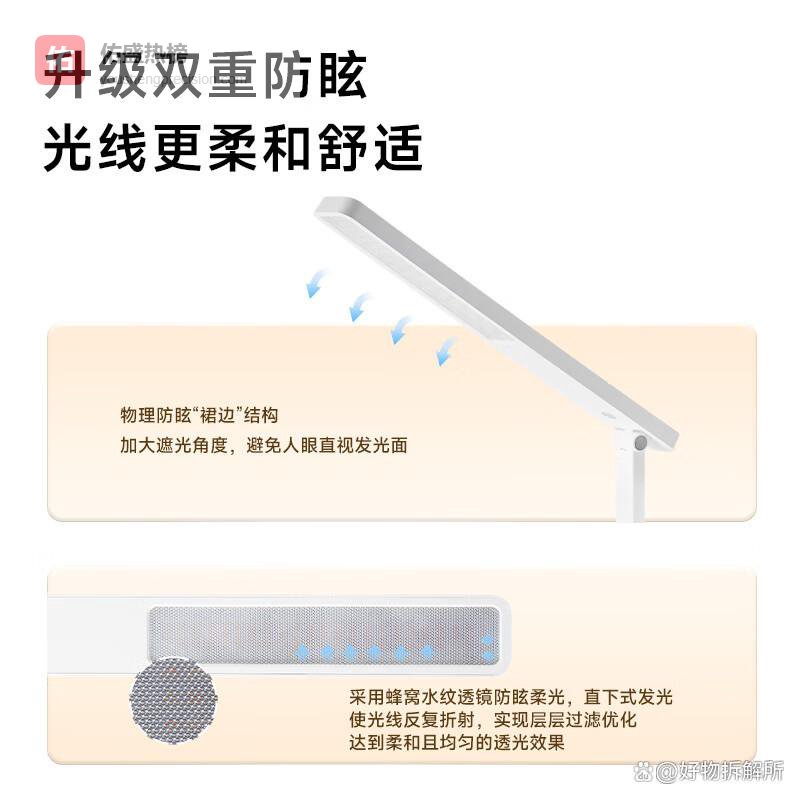 以保护视力为首要任务,这款台灯采用5A级健康光源,有效降低眼部疲劳,特别适合长时间的学习和阅读。不仅如此,独特的蜂窝防眩设计能够显著减少刺眼的眩光,为使用者营造一个舒适的学习环境,助力高效学习与工作。
