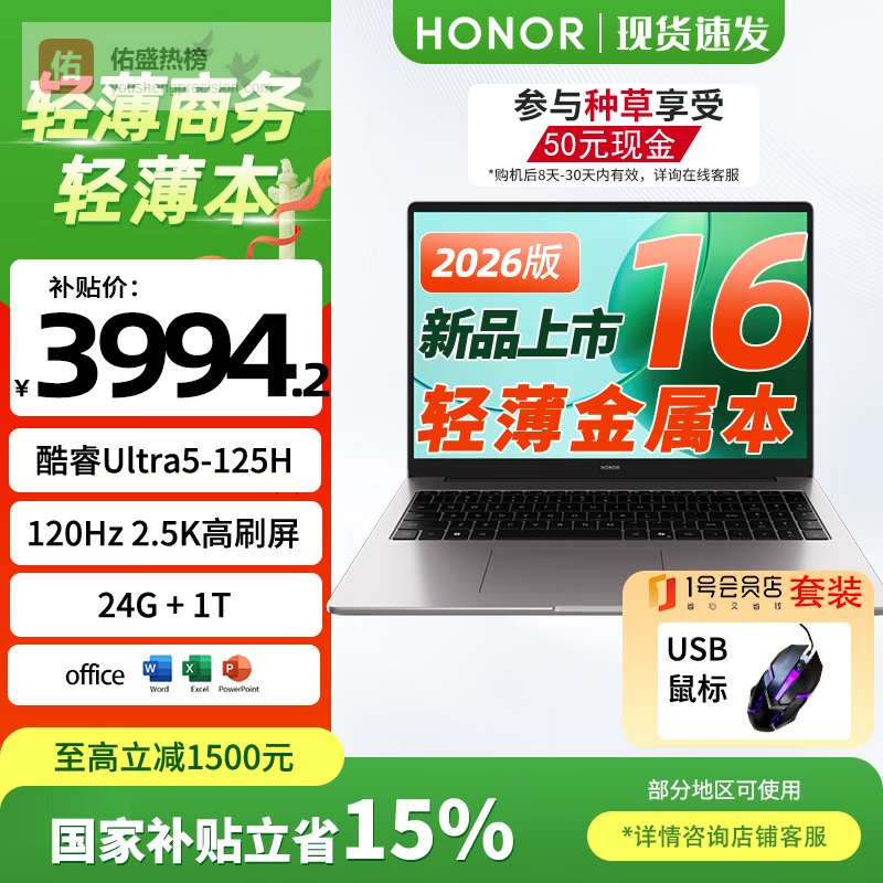 荣耀笔记本X16 2026 酷睿Ultra5-125H轻薄商务办公笔记本电脑24G 1T 120Hz 2.5K护眼+1号店鼠标套装¥