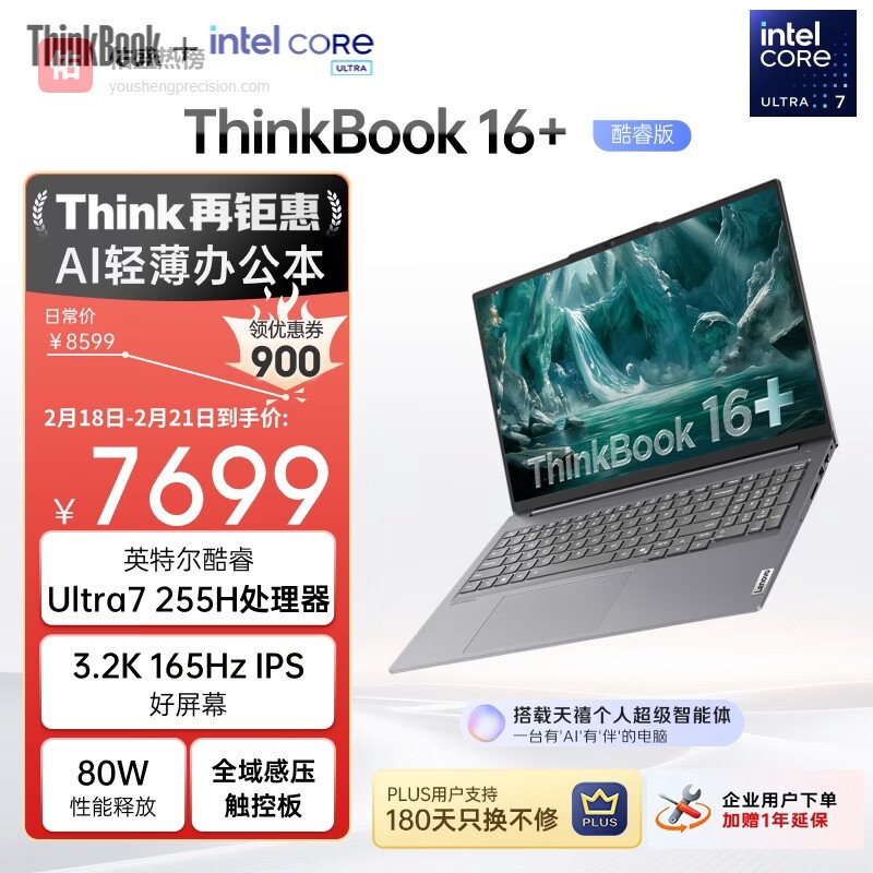 ThinkPad 联想笔记本电脑ThinkBook16+ AI轻薄办公本 英特尔酷睿Ultra7 16英寸 32G 1T 3.2K 165Hz国家补贴¥