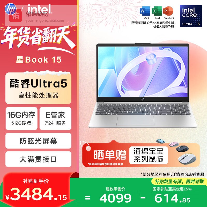 惠普HP【国家补贴】星Book 15.6英寸大屏轻薄笔记本电脑(酷睿Ultra5 125H 16G 512G AI)银¥