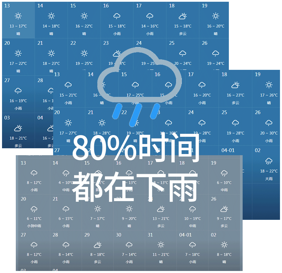 我查了好几个城市的天气,接下来还有大半个月更是连续不间断下雨雨...