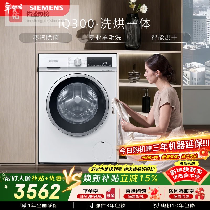 【京东自营】西门子iQ30010KG大容量全自动滚筒洗衣机自带烘干洗烘一体蒸汽除菌羊毛洗智能烘干WN¥