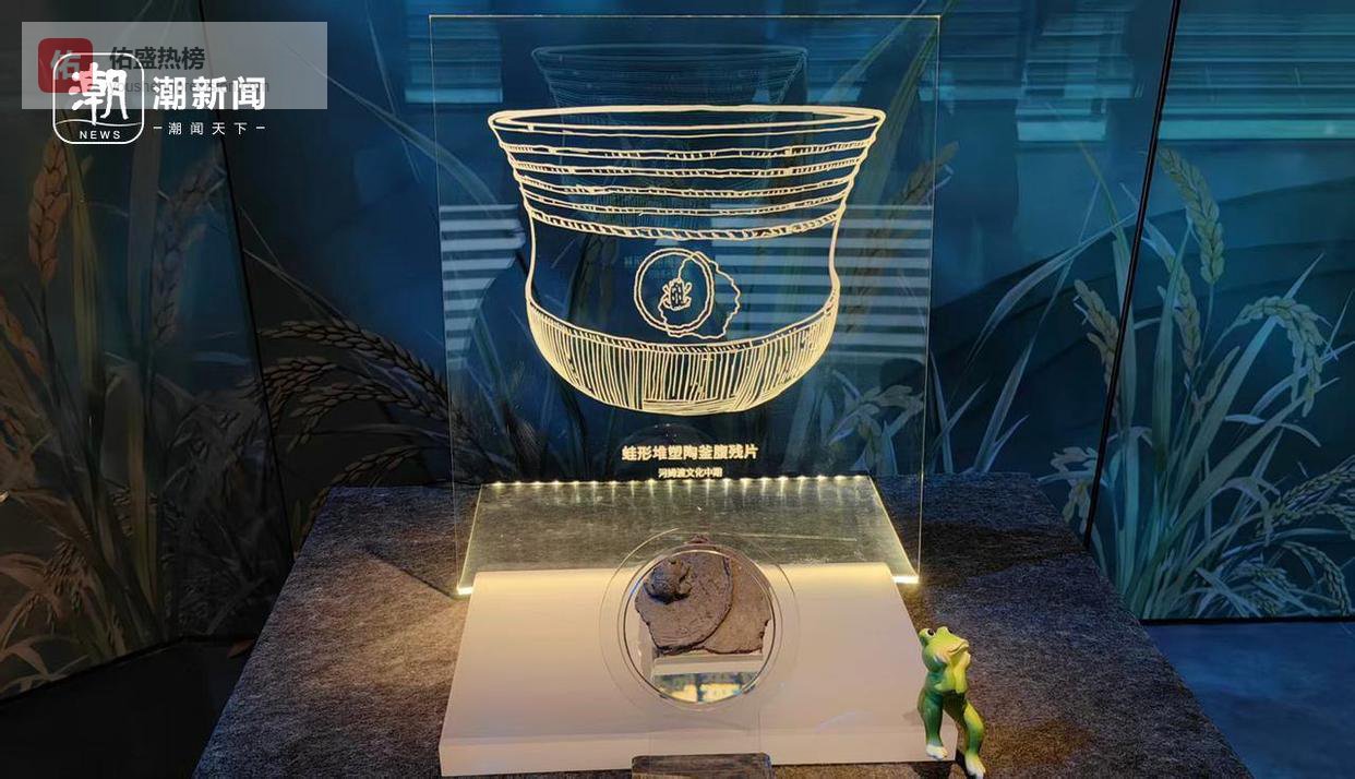 展览现场展示的蛙形堆塑纹陶片,为首次在河姆渡文化中发现
