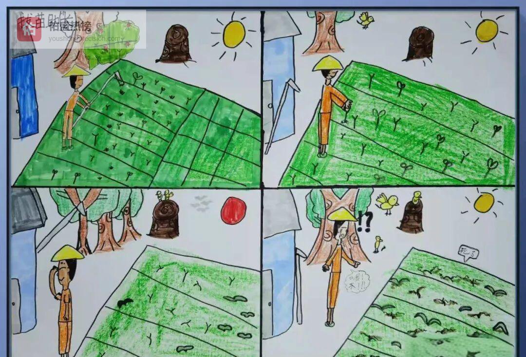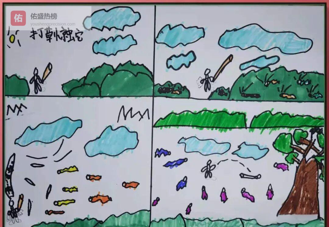 ❒ 《打草惊蛇》言言 言言把“打草惊蛇”画成草、蛇、猎人三段式:草在晃,蛇在逃,猎人举枪追。他给画面配文:“本来不想惊,一吓全线崩。”猎人的鲁莽与蛇的惊惶同框,孩子一眼读出:做事要瞻前顾后,别草率。