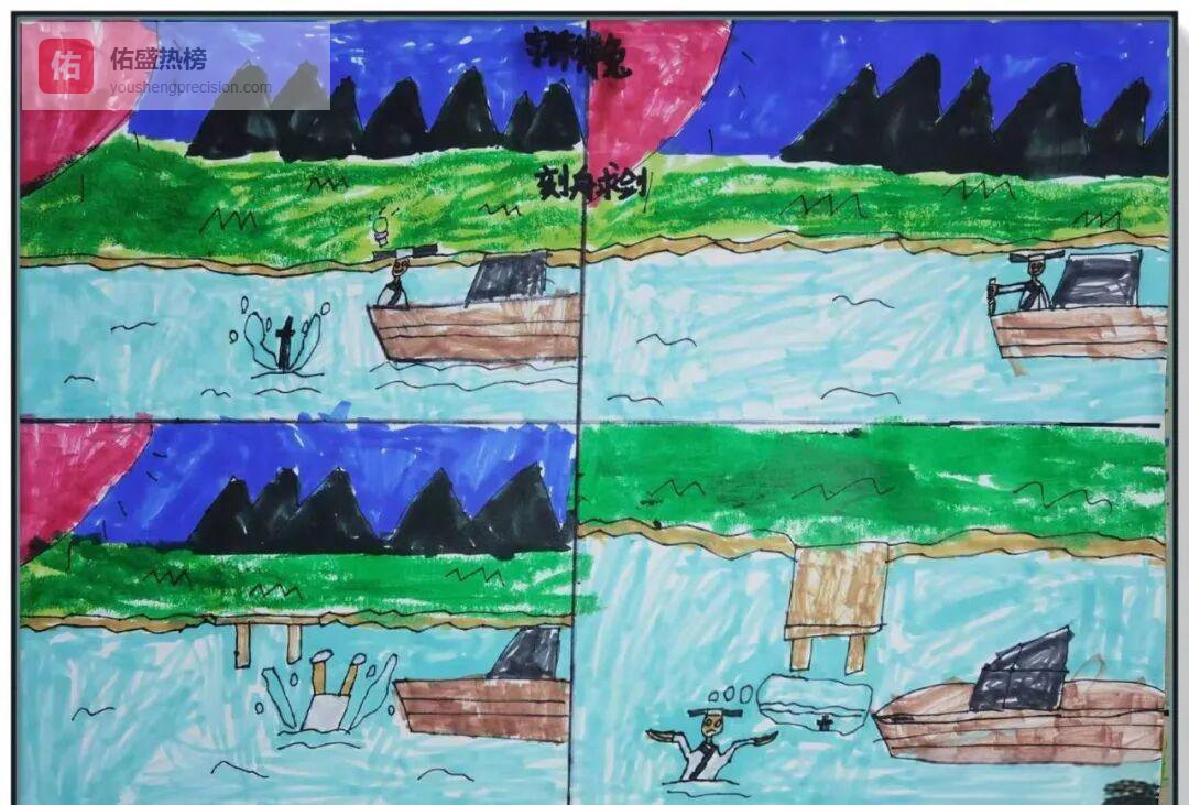 ❒ 《刻舟求剑》小满 小满把船、剑、刻痕全部画在一张A4纸上,却故意让“剑”飘在河面上,刻痕离剑身十万八千里。老师故意问:“这样真能找到剑吗?”孩子抢答:“船动剑不动,傻瓜才信!”画面一完成,“刻舟求剑”的荒诞感扑面而来,寓言里的“蠢操作”瞬间成为全班笑点。