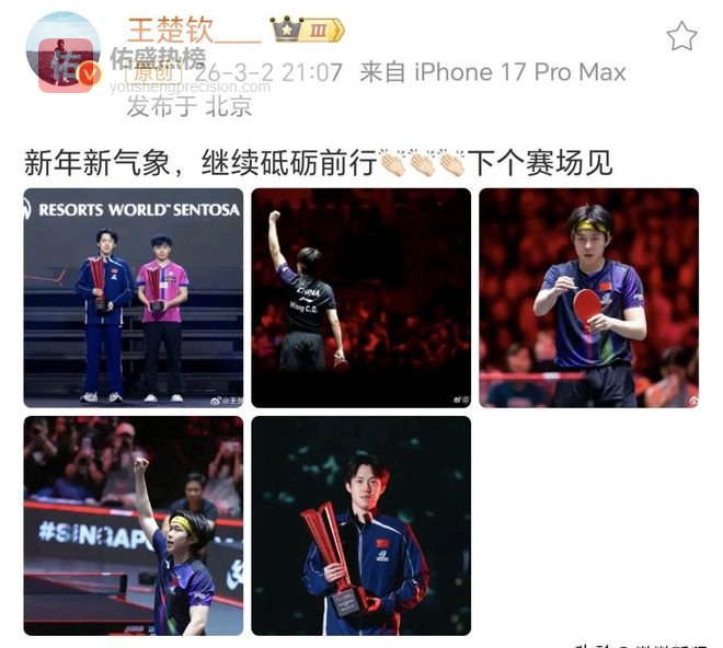 没隔多久王楚钦又更新了微博,直接给所有关心他的粉丝吃了定心丸,文案写着“新年新气象,继续砥砺前行,下个赛场见”。配的九宫格里还有他和林昀儒的合影,第五张是他抽时间去海洋馆拍的城市宣传照,打完比赛连逛一圈新加坡的时间都没有,连夜赶工拍完,第二天一早又飞北京,这强度真的不是一般人能扛的。