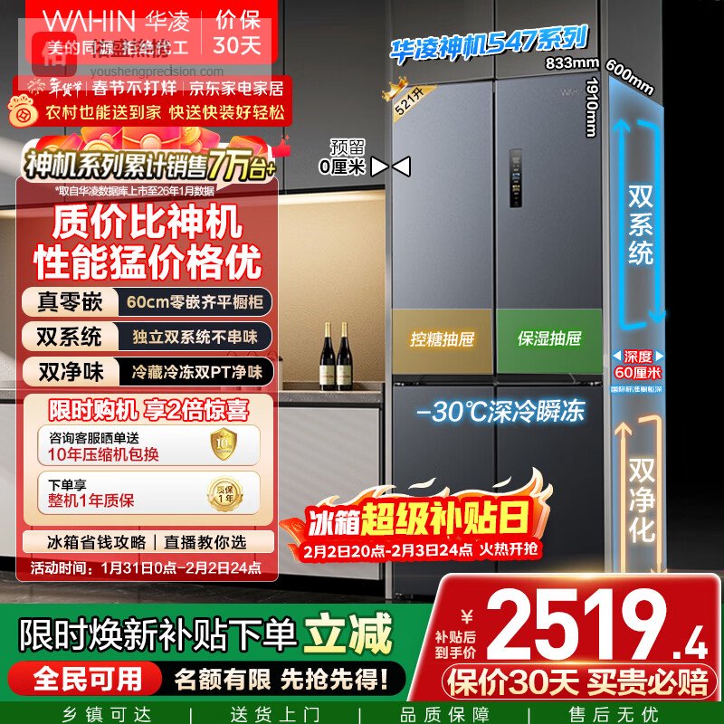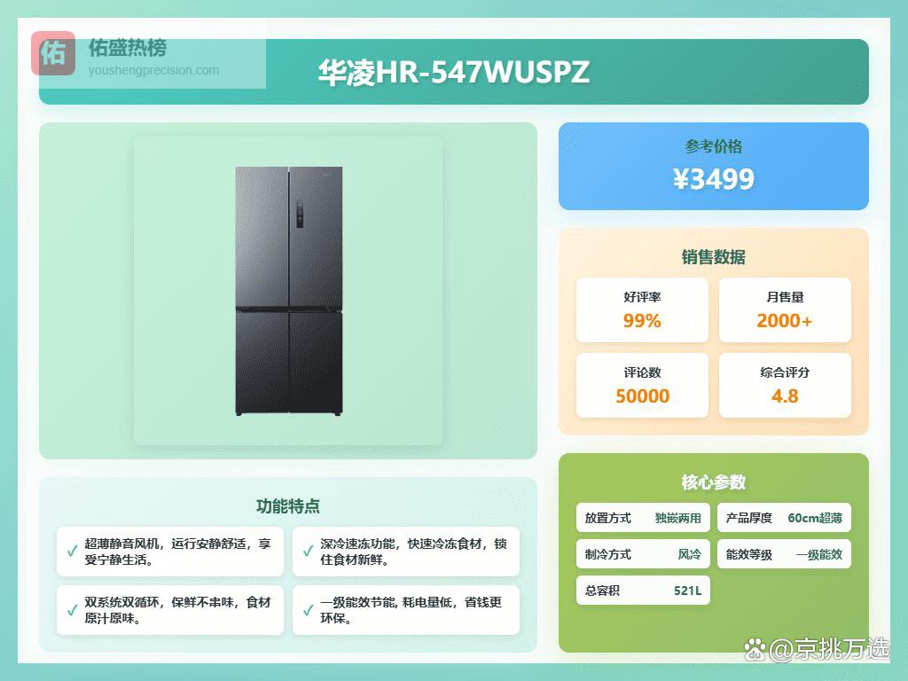 5、华凌神机547这款华凌冰箱亮点不少,双系统双循环设计,能让冷藏和冷冻各司其职,告别食物串味。而且它还很省空间,60cm超薄机身,能做到零距离嵌入,厨房颜值瞬间提升。十字对开门设计,取放东西更方便,521L大容量也足够一家人使用了,各种食材都能找到自己的位置。