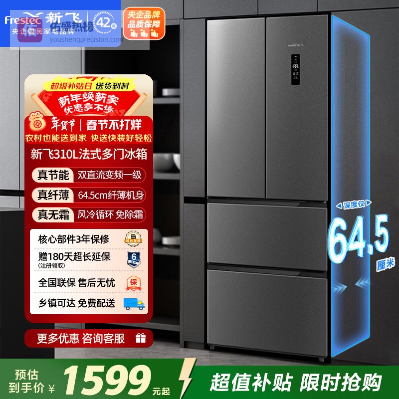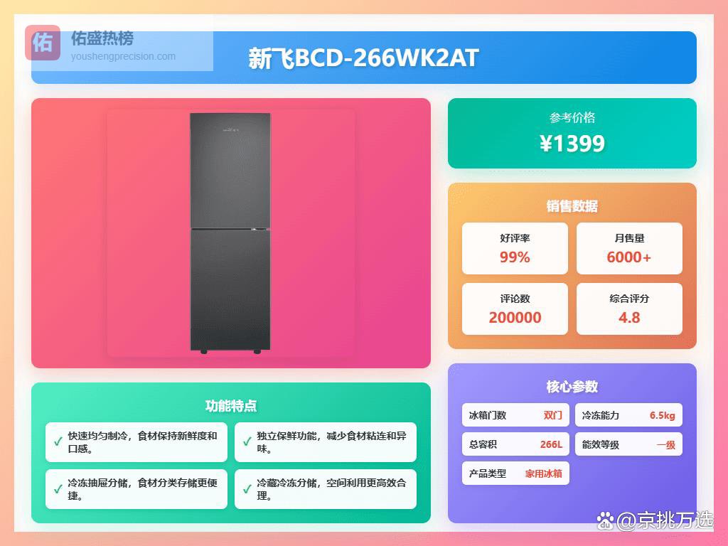 5、新飞BCD-310WK7CT新飞这款冰箱,嘿,别说,身材是真的苗条!60cm的超薄设计,能轻松嵌入你家的橱柜,简直是小户型的福音。而且它肚量可不小,310升的容量,一家三口用那是绰绰有余。多门设计,各种食材都能找到自己的专属位置,再也不用担心串味啦!