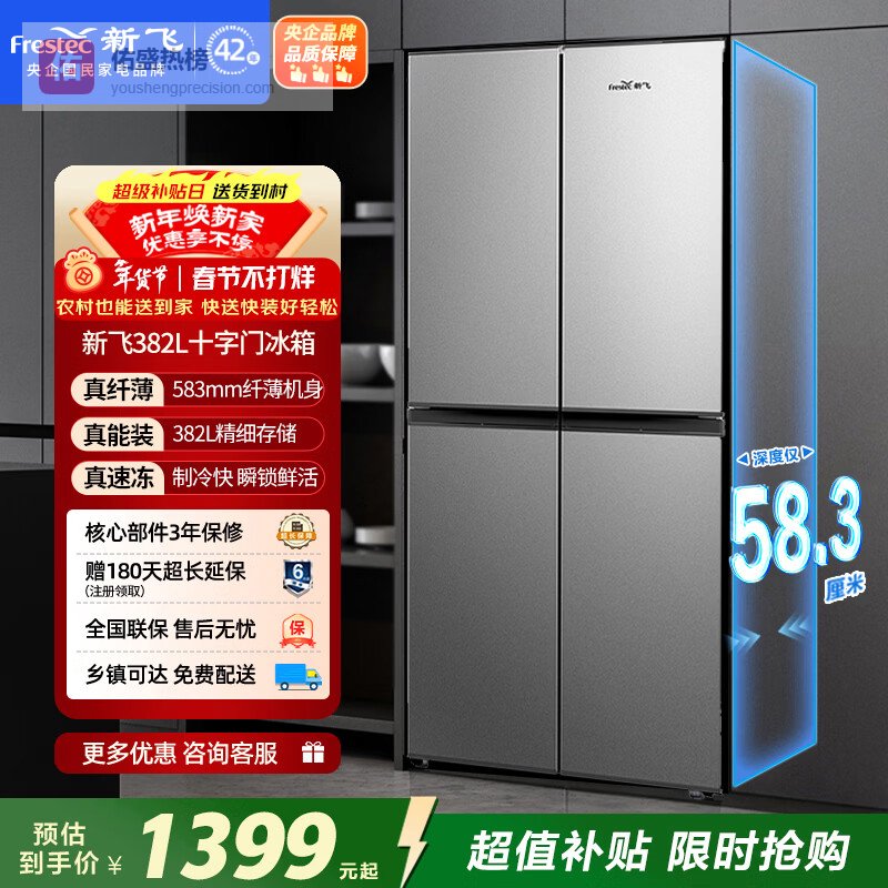 2、新飞BCD-382LT8EH这款新飞冰箱,亮点在于它的纤薄设计,厚度仅583mm,能很好地融入各种厨房环境,对小户型简直不要太友好!382升的容量也够一家人用了,冷藏室和冷冻室空间划分合理,食材分开放,味道不混杂。而且,它采用十字对开多门设计,拿取东西也方便多了。