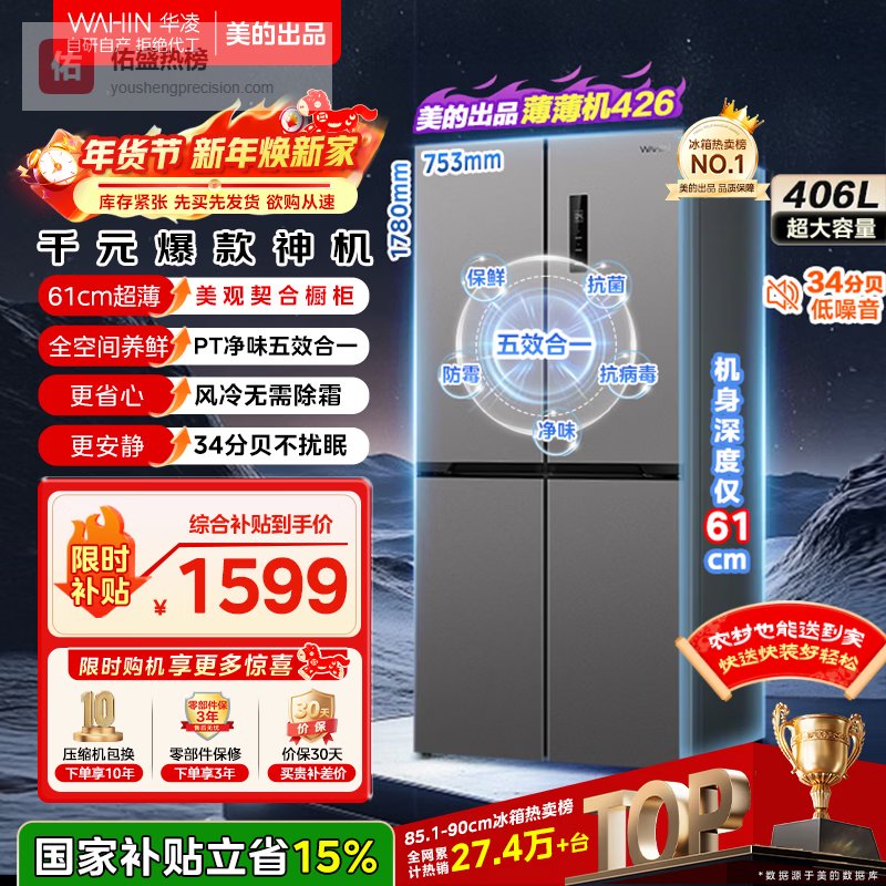 3、华凌HR-426WSP这款冰箱的超薄机身设计真是绝了,能轻松嵌入橱柜,简直是小户型福音!而且它还拥有406L的超大容量,内部15格精细分储,各种食材都能安排得明明白白,再也不用担心冰箱乱糟糟啦!风冷无霜技术也超省心,告别手动除霜的烦恼。