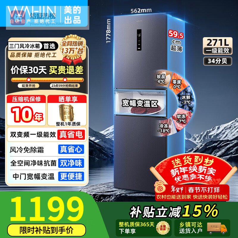 美的(Midea)出品华凌冰箱282三门冰箱超薄一级能效风冷无霜出租房屋家用变频循环大冷冻小冰箱以旧换新 HR-282WTPZ¥