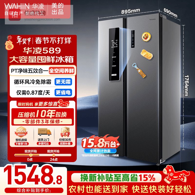 华凌冰箱美的出品【国家补贴】对开门双开门家用节能一级能效风冷无霜净味超薄大容量电冰箱HR-589WKP¥